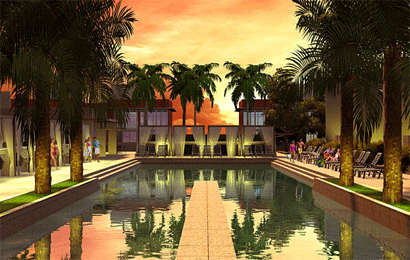 by lush landscaping and water features