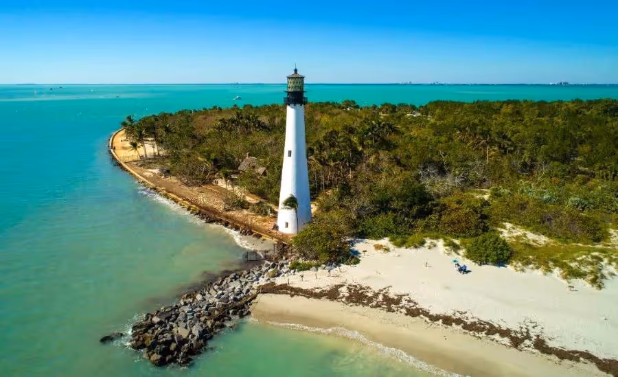Just across the Rickenbacker Causeway lie the neighboring isles of Virginia Key and Key Biscayne, where for a toll (still modest), you’ll feel like you’ve been transported back in time to an earlier Miami—one without so much crazy development, traffic, and bustle. People relax on narrow beaches amid the coconut palms, listening to radios while they grill their barbacoa. Antiquated marquees promote the simpler roadside attractions of yesteryear, while you ride by, humming the theme song to Flipper. Follow the road to the southern end of the island—past the lush palm groves and Key Biscayne Village—and you’ll soon arrive at Bill Baggs Cape Florida State Park (1200 South Crandon Blvd., Key Biscayne, 305-361-5811).