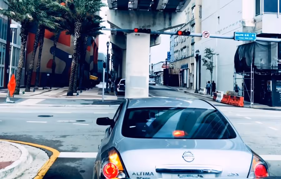 When you approach any intersection, you should pull out as far as possible so as to allow as many cars as can fit to tailgate behind you through the red. This is what passes as common courtesy in Miami.