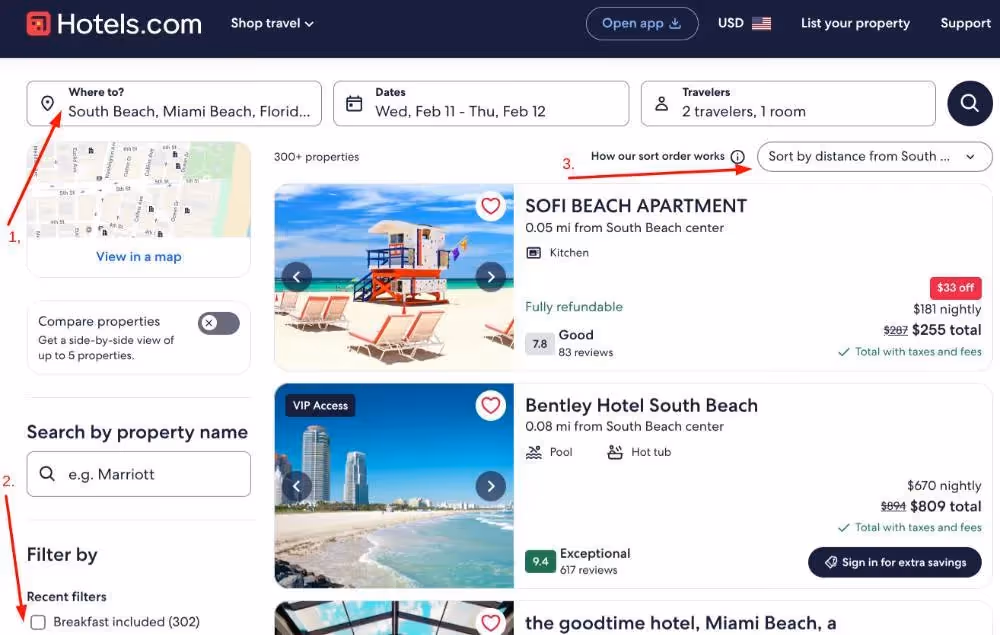 Step 1: Go to Hotels.com and say you want to go to "South Beach"
