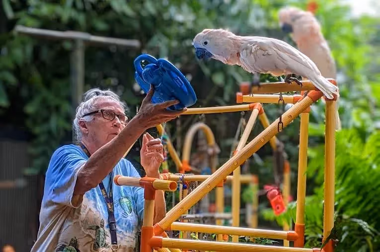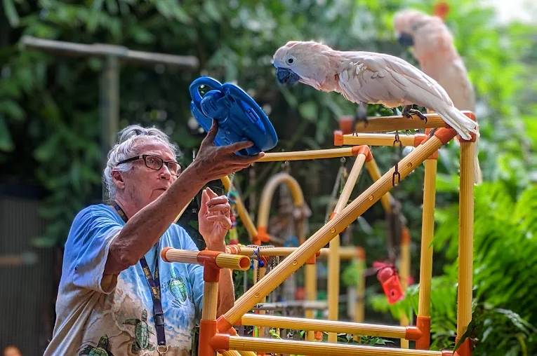 Nancy has tended this lush assortment of ferns, orchids, bromeliads, cycads, heliconias and bamboo for over 35 years now, surviving the fiercest onslaughts by hurricanes and developers alike, and her dedication shows. Along with being an is a artist, teacher, and plant & animal lover, Nancy has been rescuing, re-homing orphaned parrots for 35 years.
