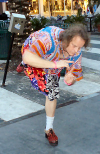 He’s all over the map—frenetic, face as animated as his words. Weather, politics, the elderly, the fabulous music of the 50s/60s/70s—he’ll talk about anything. And he’s on—warm, vibrant, mile-a-minute “Don’t Stop ’Til You Get Enough.” Just like when he transforms into the larger-than-life cross-dressing ballerina for the Lincoln Road crowds, whether it’s one person or fifty staring curiously.
