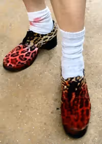 When we meet, he’s in a blue-and-orange blouse with a red-and-yellow flowered skirt. Purplish leopard-print platforms cover mismatched white-and-gray socks. Pink plastic bracelets, Mardi Gras beads dangling loosely. Unmistakable.