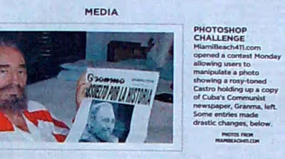 ONLINE CONTEST: Community website MiamiBeach411.com opened a contest Monday allowing users to manipulate a photo showing a rosy-toned Castro holding up a copy of Cuba’s Communist newspaper, Granma. The creator of the best image wins a ticket to Disney World. One entrant placed a copy of Maxim magazine in Castro’s hands; others came up with more devilish versions.”