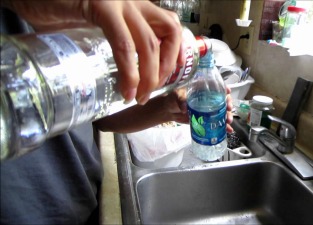 What you do: Buy liter-sized bottles of water. Empty them out and fill with your choice of select clear liquors. Then glue the caps back on to renew the seal. (Alternately: Boil the tops of the bottles and slide the caps off, seal intact, then replace).