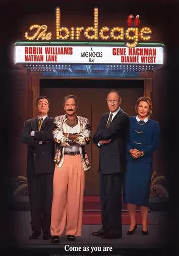 Released in March 1996, The Birdcage is a remake of the 1978 French film La Cage aux Folles, directed by Mike Nichols. The story centers on the impending marriage of Val Goldman (Dan Futterman) and Barbara Keeley (Calista Flockhart), and the cultural collision that follows when their wildly different families agree to meet.