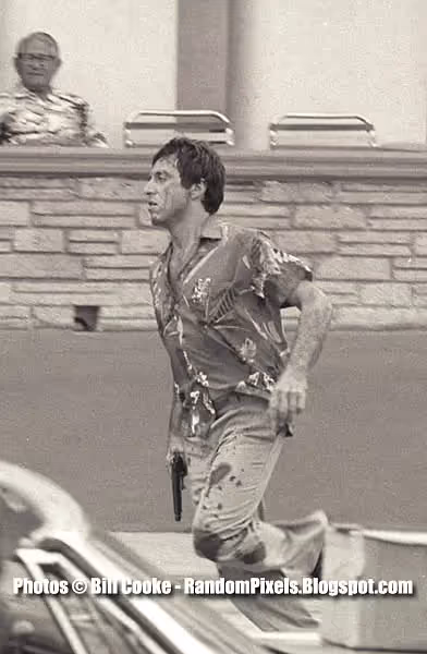 As the afternoon light faded, a dummy replaced the actor. Pacino aimed, the technician flicked a switch, and the dummy’s head exploded. I captured it ALL – a shot no other Miami photographers got.